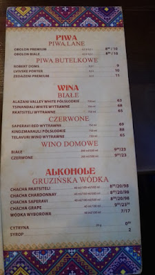 Menu restauracyjne okazało się bardzo bogate. Główna ulotka nie zawiera cen, musimy po nie sięgnąć dopiero głębiej do menu. Ponieważ do restauracji wybrałam się nie z głodu, a z czystego sentymentu, postanowiłam poprzestać na zamówieniu porcji chinkali (30 zł) i gruzińskiej lemoniady (10zł). Na porcję składało się 5 sztuk dorodnych, świeżutko przygotowanych chinkali. Niestety, cały efekt popsuł kelner, który najpierw koniecznie chciał posypać wszystko pieprzem, a potem uparł się, aby stać nade mną i tłumaczyć mi, jak prawidłowo jeść potrawę. Gdyby był to Gruzin, byłoby to nawet zabawne, ale młody Polak klepiący wyuczoną formułkę był irytujący, bo nie przestał nawet, gdy powiedziałam mu, że doskonale sobie poradzę. No nic, widocznie takie ma polecenie od szefa. Komiczne było dla mnie też to, że lemoniadę pić można było tylko z wielkiego kieliszka do wina, a poproszony o szklankę kelner obruszył się, że "u nich się tak nie pije". Ech. Najważniejsze jednak, że chinkali okazały się bardzo smaczne i sycące (choć szkoda, że nie można samemu decydować o rozmiarze porcji).